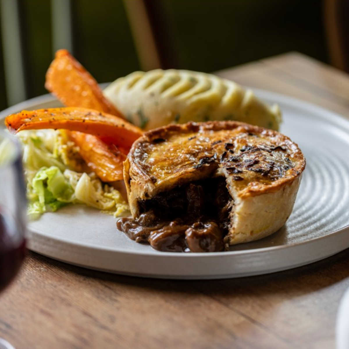 All our pies are served with mash or skin-on chips and seasonal veg