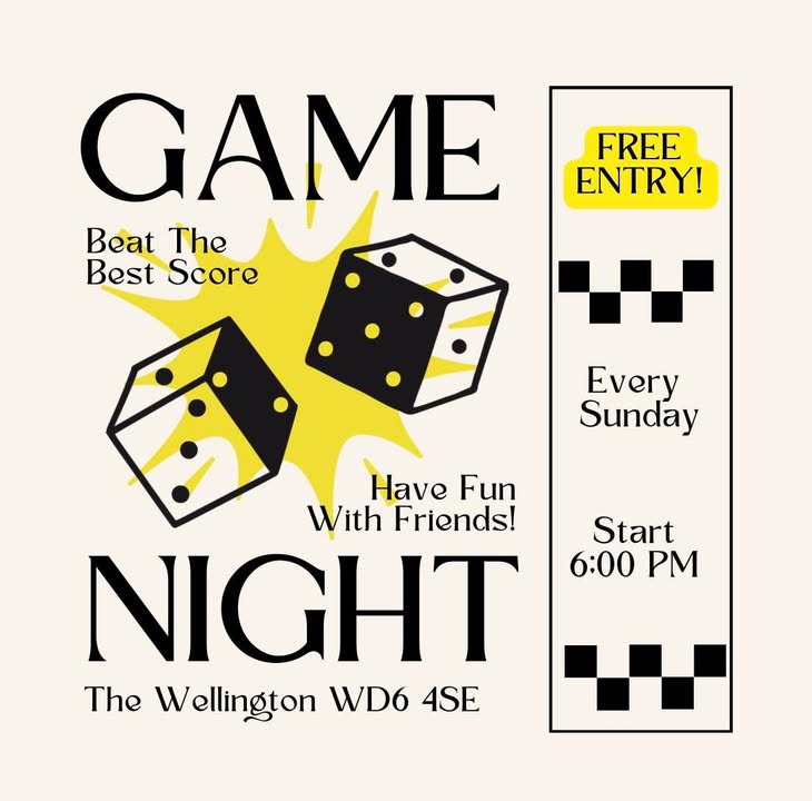 Games Night Every Sunday! Grab a game and enjoy your Sunday evening with us! Food served until 18:00 If you would like food after this time please give us a call to pre order. Would could be better than a chilled Sunday evening at The Wellington. Families welcome !